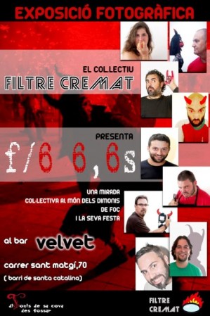 El col·lectiu ‘Filtre Cremat’ exposa aquestes setmanes al Bar Velvet, a la barriada de Santa Catalina de Palma. És una col·lecció d’instantànies al voltant de l’espectacle dels correfocs que ha anat rotant per diferents municipis i que s’inaugurà a Sineu, a l’Hotel Son Cleda, ara precisament fa un any (vegeu Díngola núm. 4, pàgina 14).
