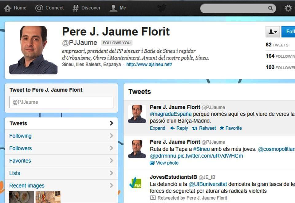 Pel que fa al Twitter, una eina més ‘professional’ que el Facebook des del punt de vista informatiu, tenen perfil creat alguns membres dels diferents partits i associacions, però en general no hi ha perfils específics dels partits o no són actualitzats massa regularment. Així, Sineuers Independents (@sineuers), les Noves Generacions de Sineu (@NNGGSineu), el batlle Pere Joan Jaume (@PJJaume), la presidenta dels joves del PP sineuer Laura Montenegro (@Laura90s), el secretari dels joves del PP sineuer Marc Álvarez (@Marc_A_G) i el secretari dels joves del PP balear Pedro Álvarez (@PDRMNNU) tenen perfil per piular, encara que només aquests darrers, més personals, mantenen bon ritme d’activitat.