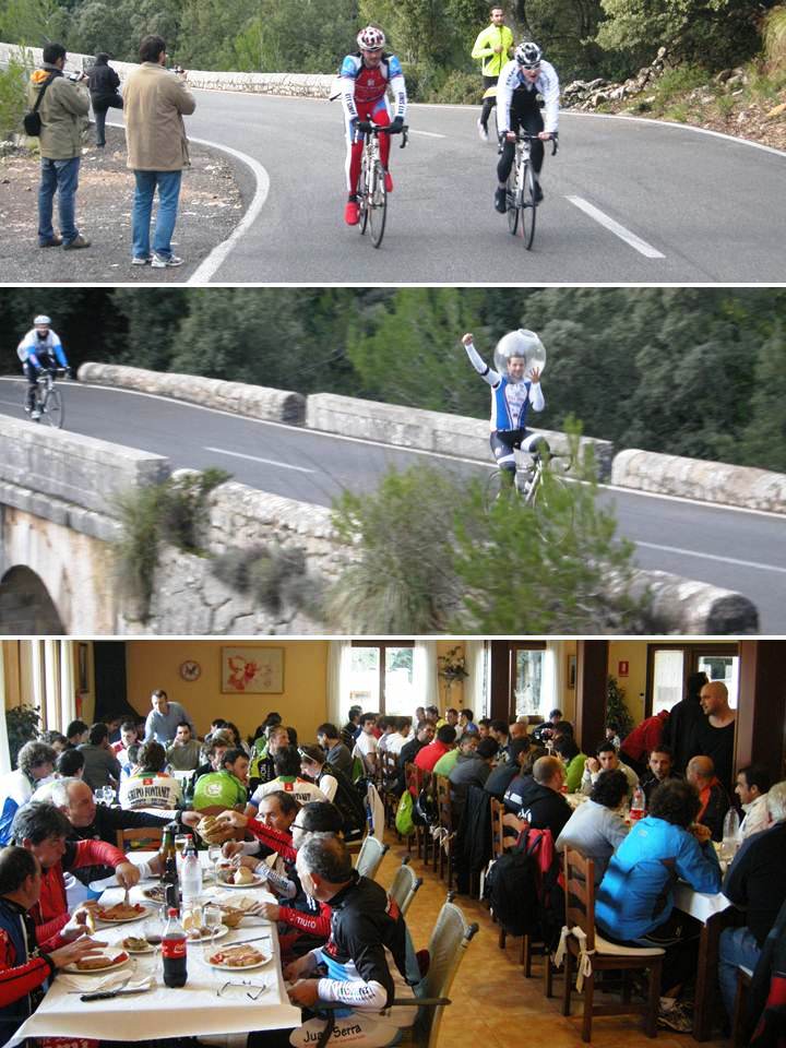 Arribada dels que pujaven en bicicleta (fotos superiors) i moment del berenar que ha aplegat 66 persones (foto inferior).