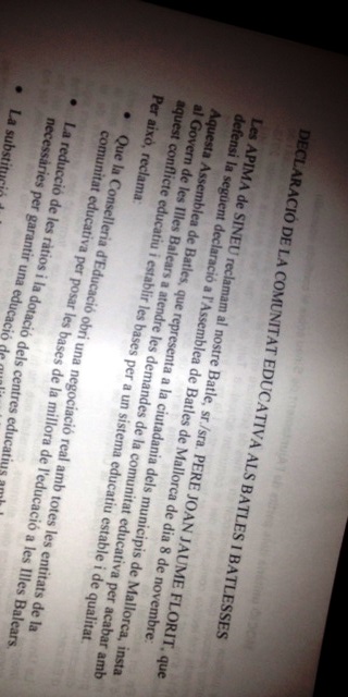 Fa uns dies, el passat 8 de novembre, el batle de Sineu, Pere Joan Jaume, que havia votat a favor dels acords exposats en el paràgraf anterior, votava en contra de la moció de suport a la comunitat educativa en l’Assemblea de Batles extraordinària convocada pel Consell de Mallorca per aquest dia.