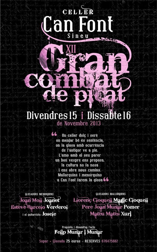 Tito Ferriol ha organitzat el XII Combat de Picat a Can Font. Ja són un clàssic de l’hivern sineuer, aquests glosats a Can Font. Aquesta vegada els artistes seran les menorquins Joan Moll Joanet, Esteve Barceló Verderol i el guitarrista Josele, i els mallorquins Llorenç Màgic Cloquell, Pere Joan Munar Pomer i Mateu Matas Xurí, presentats per Felip Munar i Munar. Serà tant avui com demà, i cal reservar taula.