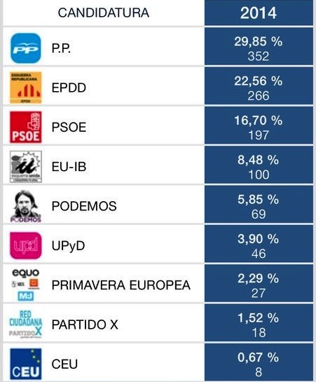Esquerra ha estat la gran guanyadora de les eleccions europees a Sineu. El partit sobiranista ha aplegat el vot de part de Sineuers Independents i de Gent per Sineu i s’ha convertit en la segona força política per davant del PSOE. El Partit Popular, en canvi, tot i guanyar, ha passat del 42’53% el 2009 a un 29’85% el 2014.