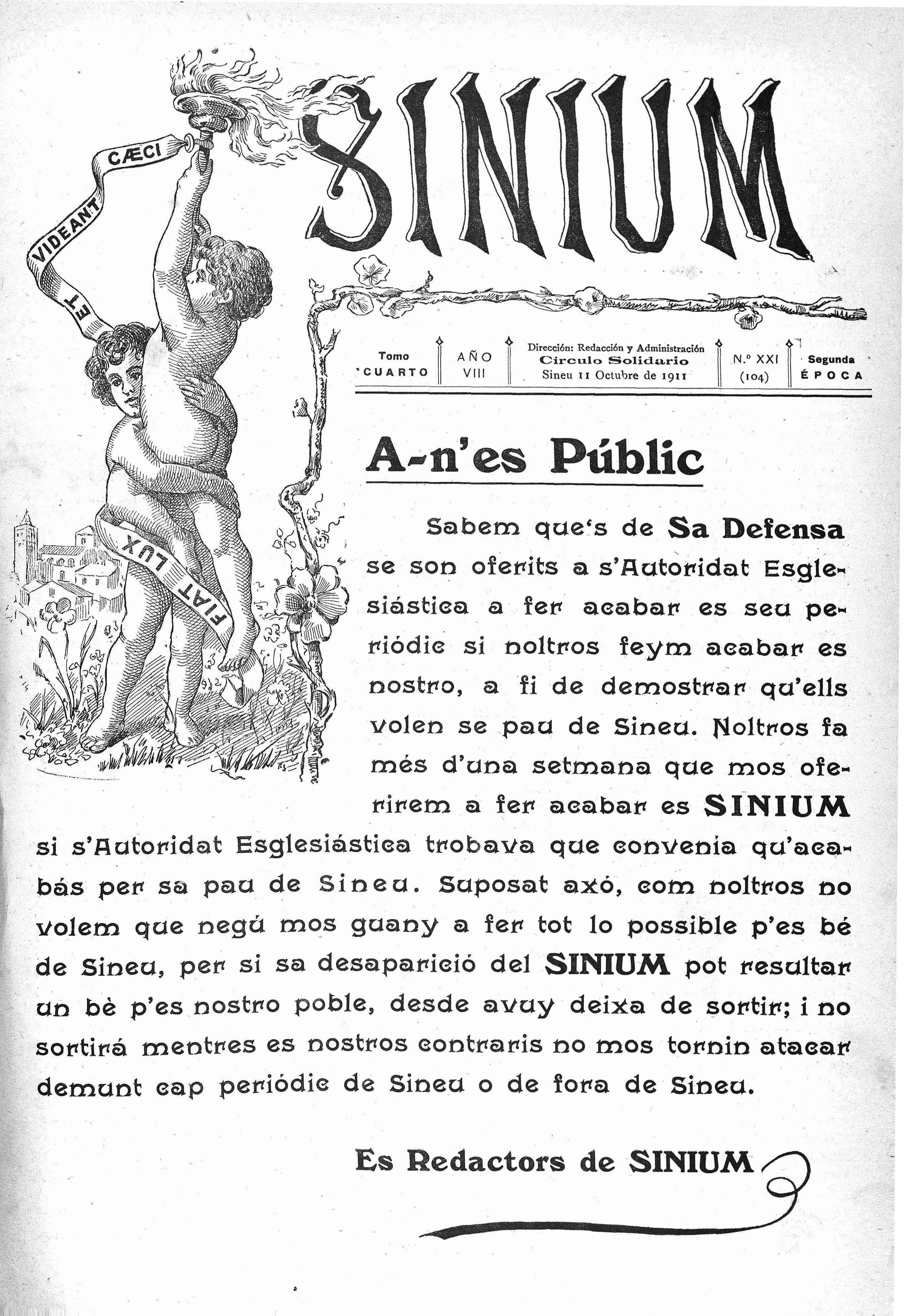 La publicació Sa Defensa. Periódico independiente* (1911) neix com a òrgan de comunicació del partit liberal (els Fogoneus, Pifolers) i com a reacció i amb la voluntat de donar la rèplica a la publicació Sinium* (1905-11), mitjà de comunicació de partit conservador (els Pellosos, Solidaris, Rippes, Ximbombers). Ambdues aporten una interessantíssima informació sobre aquestes dues faccions polítiques i les seves polèmiques. Una i l’altra s’acomiadaren dels lectors amb una nota adreçada al públic l’octubre de 1911, fruit del pacte, amb la mediació de l’autoritat eclesiàstica, amb el qual es tancava la polèmica i s’establia un cessament dels atacs.