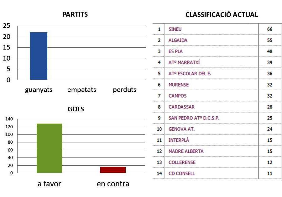 Els números dels cadets són de rècord; 22 partits disputats amb 22 victòries; 128 gols a favor i només 16 en contra; els dos màxims golejadors del grup on juguen són del CE Sineu: Adrian Rodríguez amb 35 gols i Domingo A. Blesa amb 32 gols.