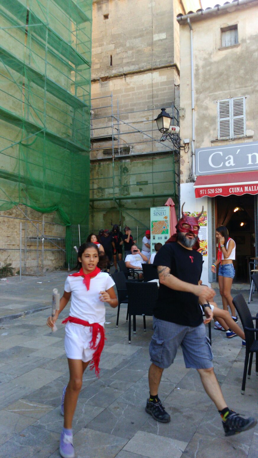 Avui dematí amb puntualitat sineuera, amb deu minutets de retard passades les deu, s’ha iniciat el Sant Fermí Dimoni. Nins i nines de totes les edats, pulcrament vestits de blanc, amb mocadors i faixes vermelles, com marca la tradició navarresa, s’han concentrat a la plaça de l’església. Mentrestant, amenitzaven la jornada festiva els Xeremiers de Sineu, que substituïen els txistus, que solen sonar a la capital dels encierros, per uns sons més nostrats.