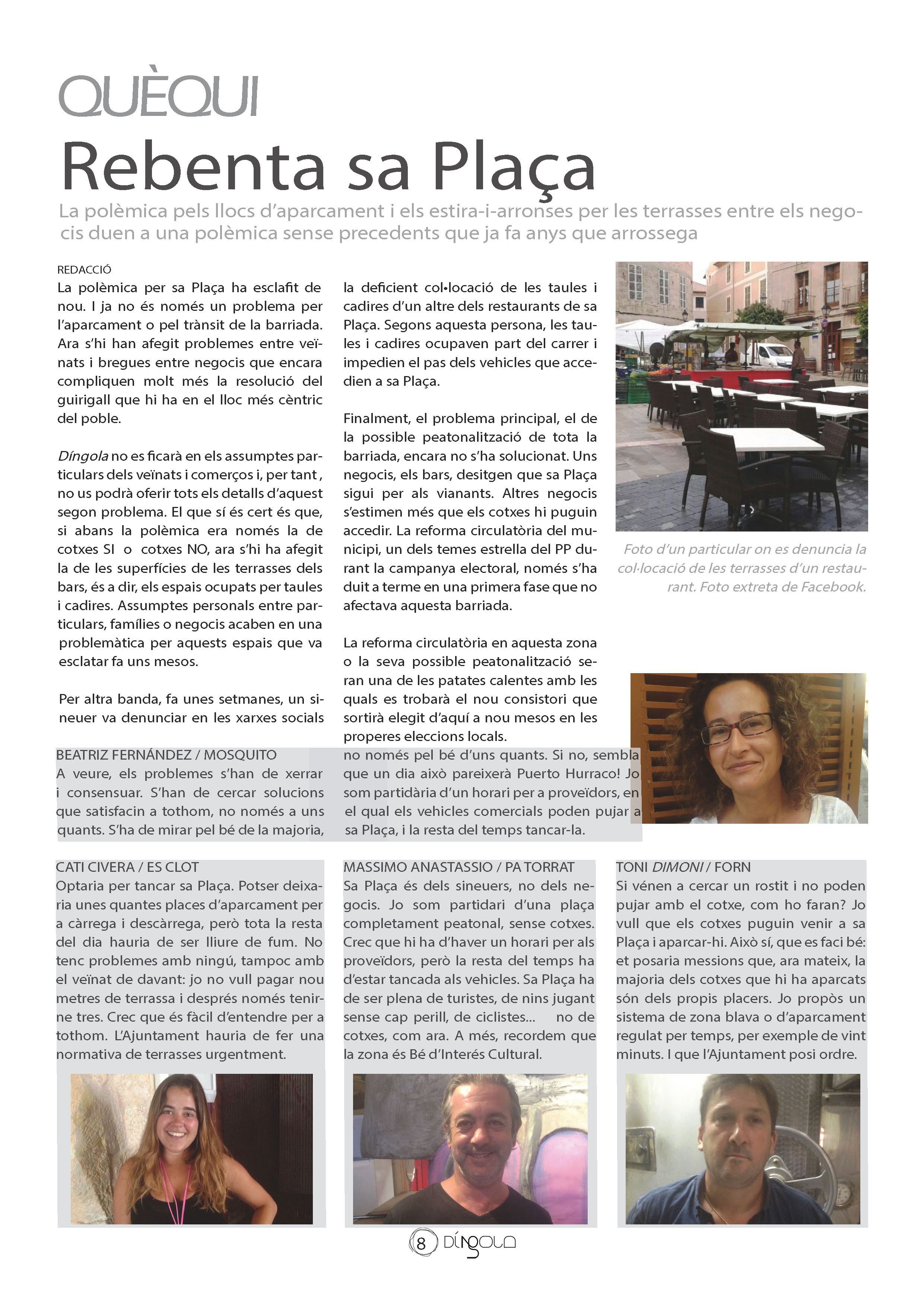Aquest vespre el ple de l’Ajuntament de Sineu aprovarà una nova ordenança sobre l’ocupació de la via pública per part de bars i restaurants (això és, les terrasses amb taules i cadires). Aquesta ordenança ja va ser demanada fa just un any per alguns propietaris de negocis de restauració. La mateixa Cati Civera, propera al Partit Popular (que aleshores governava) i aleshores propietària del negoci d’Es Clot, manifestava a Díngola en paper la necessitat d’aquesta ordenança (vegeu Díngola número 14, pàgina 8). Uns dies abans havia rebentat l’enèsima polèmica a sa plaça, i no només per un problema d’aparcaments o pel trànsit de vehicles, també per problemes entre els mateixos veïnats i bregues entre negocis.