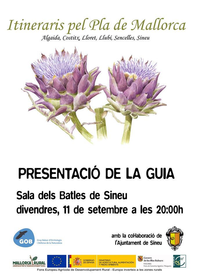 Enguany s’ha editat una nova guia, que cobreix altres municipis del Pla de Mallorca, “Itineraris pel Pla de Mallorca: Algaida, Costitx, Lloret, Llubí, Sencelles, Sineu”, que serà presentada demà divendres a les 20h, a la sala de batles de la Biblioteca Municipal. Aquesta guia, com l’anterior, mostra els aspectes biològics i culturals de diversos itineraris al llarg dels municipis que comprèn.