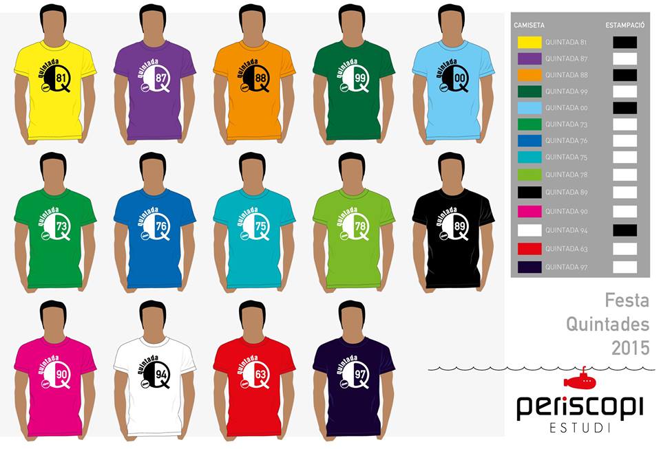 Enguany es repeteix l’experiment de l’any passat amb les quintades. El dia Q és una iniciativa d’uns quants empresaris, que agafen el model d’altres municipis on els dinars conjunts de les diverses quintades del poble són tradició. Enguany s’han fet camisetes per als diferents grups (Periscopi Estudi ha publicat la foto adjunta, on es mostra que cada quintada lluirà un color diferent) i s’ha organitzat un final de festa devora Vi-és, en les porxades dels autocars del costat de l’estació. Serà aquest dissabte.