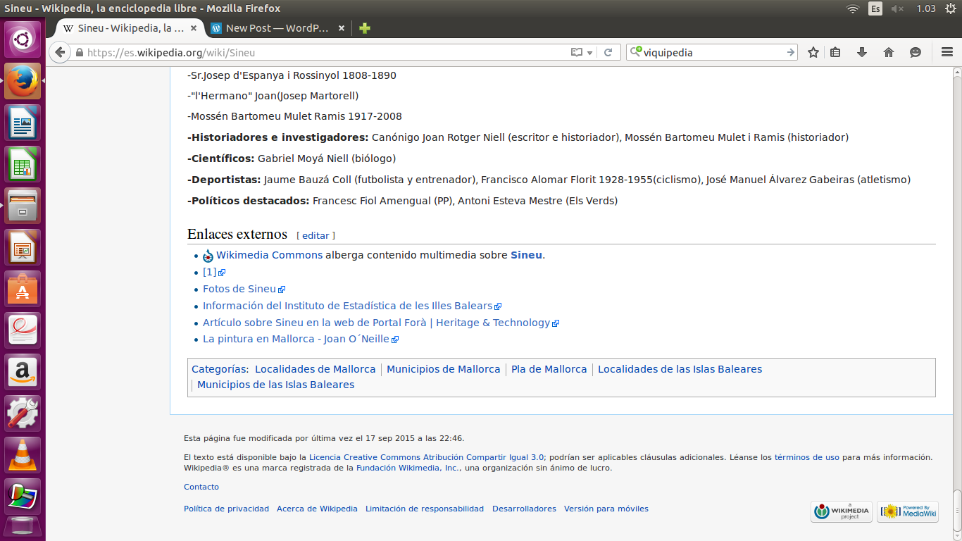 Captura de pantalla Wikipedia [Sineu] feta dia 23 d’octubre de 2015. S’hi pot veure la data de la darrera modificació (17 de setembre de 2015).