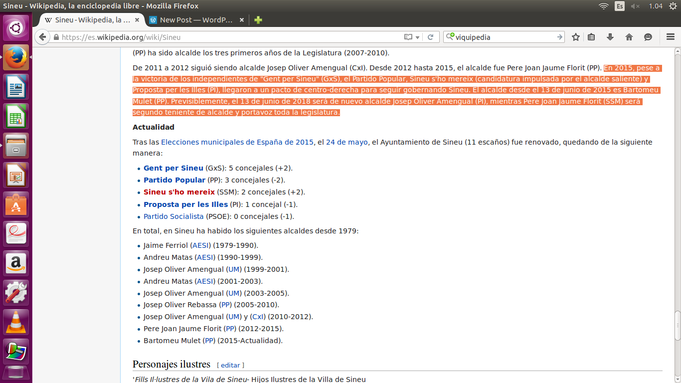 Tot i que això hagués estat un escenari possible, i és segur que desitjable per més d’un militant o votant dels tres partits conservadors de Sineu, no es podrà dir que el paràgraf va ser redactat durant les negociacions postelectorals, pel temps verbal en què està redactat (pretèrit perfecte simple, “llegaron a un pacto“) i perquè els editors de la Wikipedia han fet la darrera modificació dia 17 de setembre de 2015, ben a temps d’haver esmenat la patinada si n’haguessin tengut voluntat.