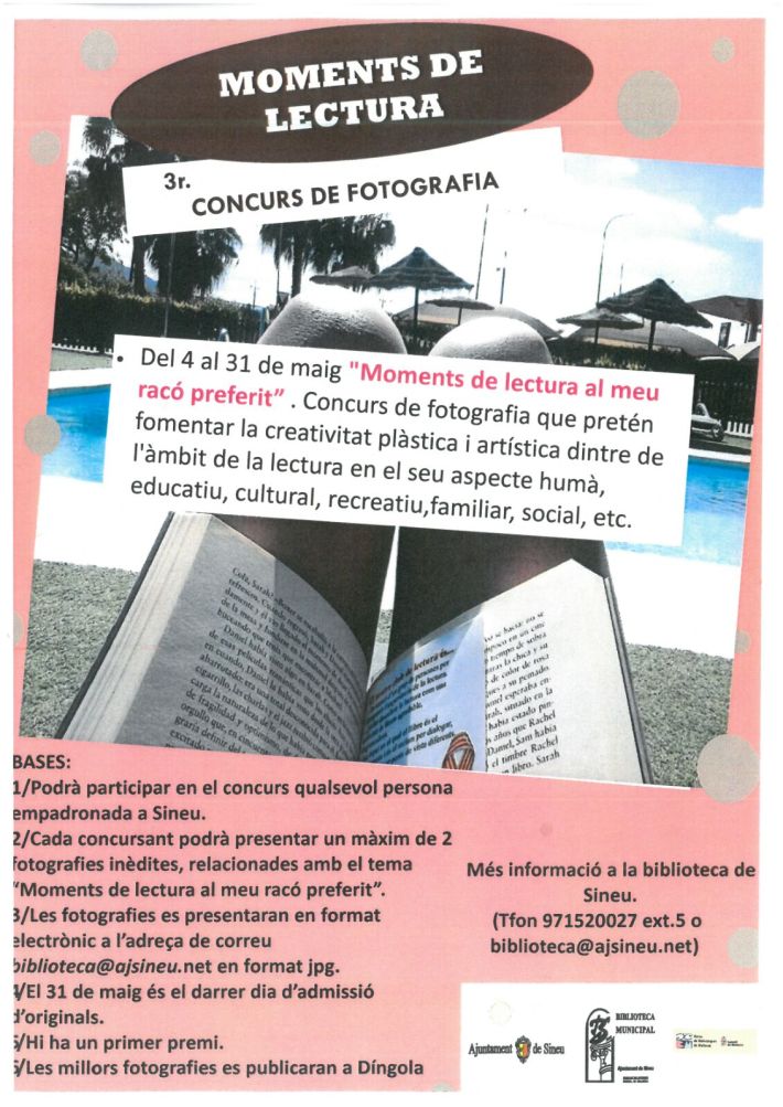 Per tercer any consecutiu la Biblioteca organitza el concurs de fotografia “Moments de lectura”. És un concurs que ajunta la literatura i la fotografia. Enguany el tema és “Moments de lectura en el teu racó preferit”. Potser llegiu a vorera del mar, o al llit, o a qualque lloc peculiar… El concurs és obert a qualsevol sineuer que pot presentar, com a màxim, dues fotografies. El termini acaba dia 31 de maig. Hi haurà un primer premi i les fotos rebudes seran publicades a la revista Díngola.