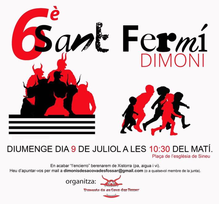 Com és habitual des de fa uns anys per aquestes dates, els Dimonis de sa Cova des Fossar tornen organitzar una mena de Sant Fermí en clau sineuera i en clau de dimonis. Serà aquest proper diumenge a les 10:30h a sa Plaça. Hi haurà berenar de xistorra i vi per els presents.