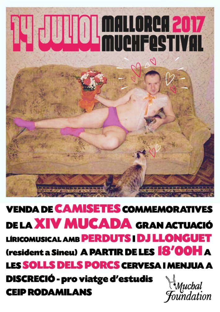 Divendres horabaixa, devora les solls del mercat dels animals, s’iniciarà la venda de camisetes i marxanderia per a tenir-ho tot a punt en aquesta 14a edició de la festa en honor a lo Much de Reig. Com cada any, la recaptació de la caixa servirà per a finançar la festa i, el benefici, és destinarà a la solidaritat. En motiu de la inauguració de la imminent nova edició, la Muchal Foundation ha organitzat el “Mallorca Much Festival”, una festa amb música i cervesa, amb mesura, en què participarà l’AMIPA de Rodamilans, que posarà un taulell amb coques i dolç per a pegar una mossegada el temps que segueixen l’actuació de “Perduts” i el DJ “resident a Sineu” Mateu Llonguet.