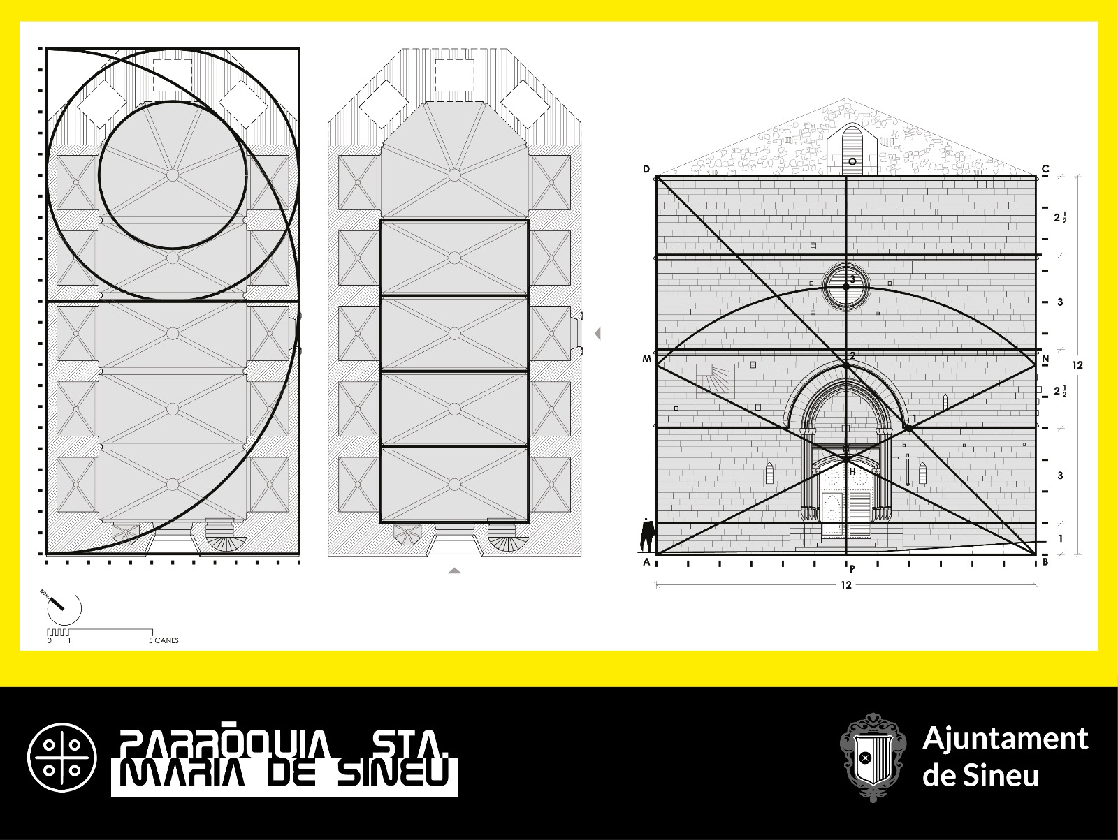 Esquemes geomètrics de l’alçat i planta de l’església elaborats per Joan Vanrell i Torelló.