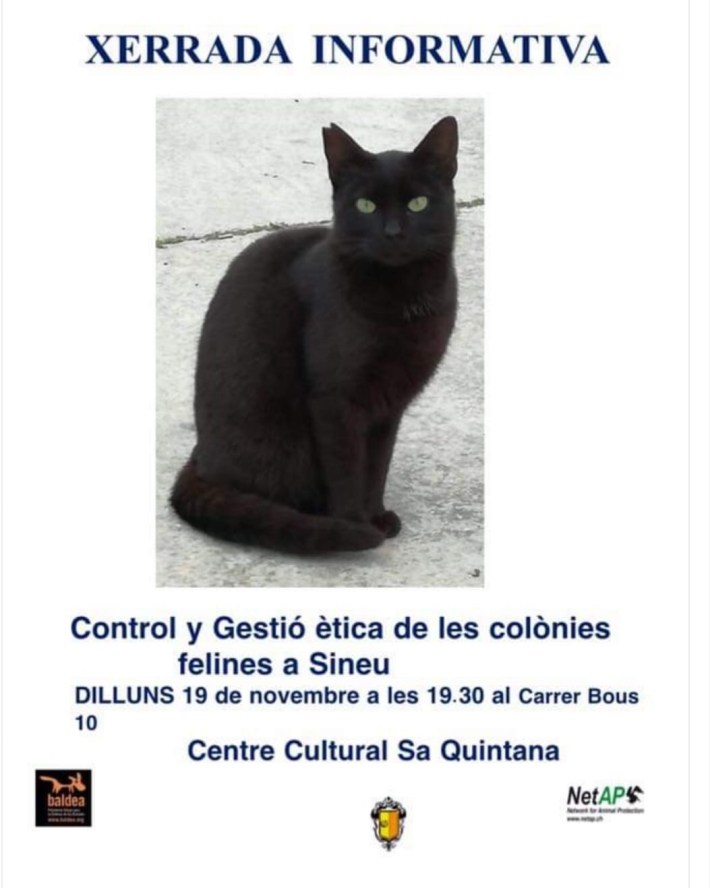 Aquest dilluns Baldea ha organitzat una xerrada, a les 19:30h, en el centre cívic Sa Quintana, amb el títol ‘Control i gestió ètica de les colònies felines a Sineu’, on es debatrà sobre mecanismes efectius contra les plagues de moixos que, així mateix, siguin respectuoses amb els animals.