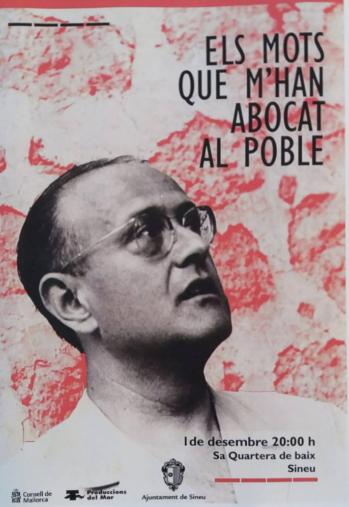 El proper dissabte, dia primer de desembre, a les vuit del vespre es representarà “Els mots que m’han abocat al poble” de Produccions del Mar, en homenatge a l’escriptor, professor, editor i activista Josep Maria Llompart (Palma, 1925-1993). Aquest acte es fa dins l’Any Llompart, que han organitzat durant el 2018 diferents institucions, entre les quals l’OCB (de la qual fou president entre 1978 i 1986), en motiu del vint-i-cinquè aniversari de la seva mort. La representació teatral serà en el nou espai de la Quartera de Baix.