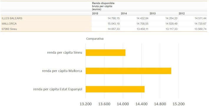 Municipis amb rendes per càpita superiors a les de Sineu són Valldemossa (21.458€), Deià (19.534€), Bunyola (17.051€) o Artà (17.034 €), per posar alguns exemples. Municipis amb rendes inferiors a les de Sineu són Inca (13.338€), Costitx (12.725€) o Formentera (10.661€).