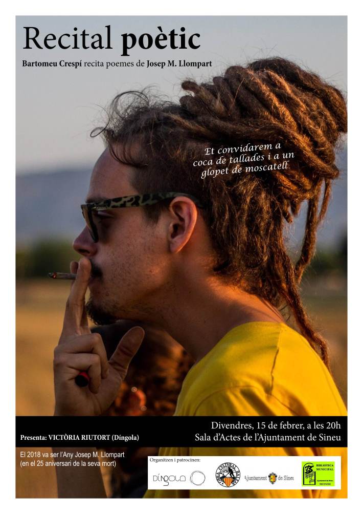 Aquest divendres, 15 de febrer, a les 20h, a la Sala d’Actes de l’Ajuntament de Sineu, es durà a terme un acte poètic a càrrec de Bartomeu Crespí, que recitarà poemes de l’escriptor i poeta Josep M. Llompart.