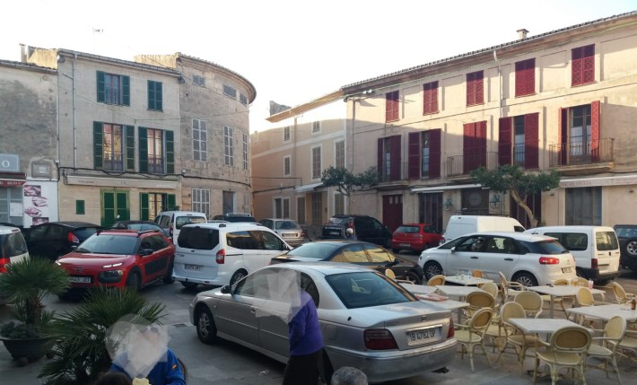 Fins 16 cotxes es poden comptar en aquesta fotografia feta avui matí a Sa Plaça. Un espai públic empedrat on només hi ha habilitats 3 aparcaments temporals per a cotxes.