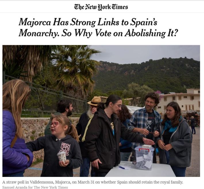 El NYT, primer diari dels Estats Units en tiratge, difusió i influència, s’ha fet ressò de les consultes ciutadanes de Mallorca. Així, en aquest article (fes clic), el diari explica el contexte de les consultes, i les relaciona amb el procés independentista català.