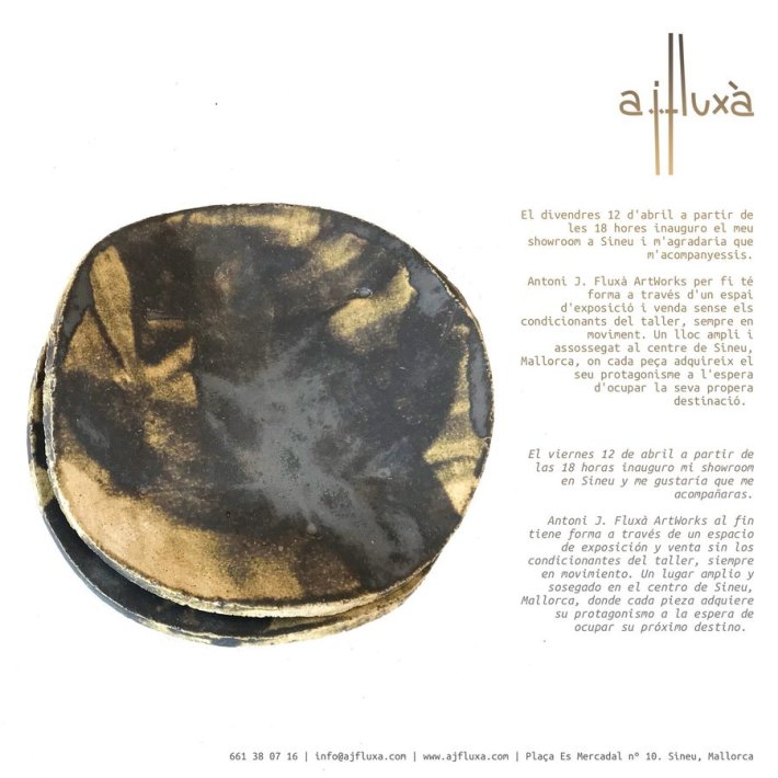 Antoni J. Fluxà, arquitecte, sonador -vegeu-lo actuar amb Xeremiers de Sineu o amb Copeo de Sineu-, i de fa poc temps retirat de l’activitat professional al cap davant d’una administració de loteria a Inca, està actualment immers en una de les seves més grans passions: l’art en ceràmica, formigó, fusta… Fluxà recentment ha trobat l’espai necessari on des d’ara podrà mostrar les seves creacions i posar-les a disposició de qui en vulgui adquirir qualcuna: l'”Antoni J. Fluxà Artworks“, en el nombre 10 de la plaça del Mercadal, damunt la riba. La inauguració d’aquest nou local dedicat a les arts plàstiques serà aquest divendres, 12 d’abril, a partir de les 18 h del capvespre.