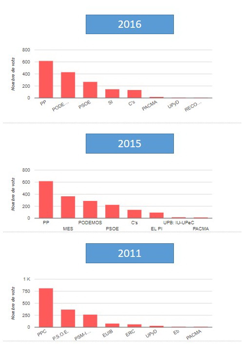 A Sineu l’evolució del vot entre el 2011 i el 2016 (quan es feren les darreres eleccions) ha estat aquesta: