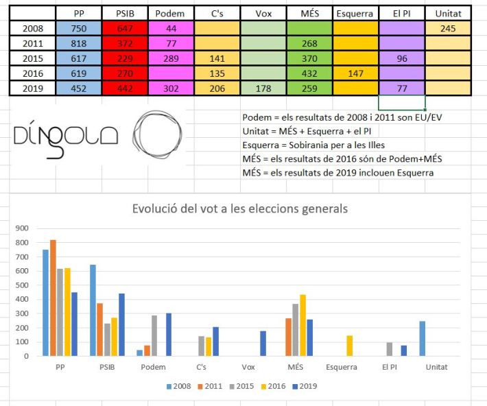 Així, l’evolució del vot entre el 2008, el 2011, el 2015, el 2016 –quan es feren les darreres eleccions generals– i el 2019 ha estat, segons el partit en qüestió, aquest: