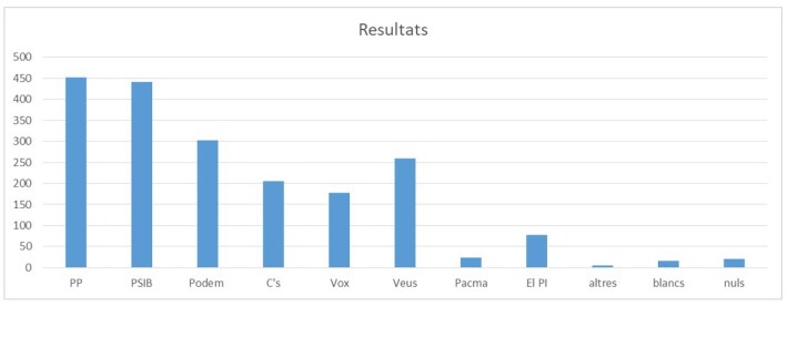 Amb el 100% escrutat, el partit més votat ha estat el PP (amb 452 vots), però seguit de molt prop per PSIB (a només 10 vots, amb 442 vots), i també per Podem (amb 302 vots). Veus Progresistes (ARA-MÉS-ESQUERRA) obté una gens menyspreable 4a posició (amb 259 vots), per davant de Ciudadanos (amb 206 vots). El partit d’ultradreta VOX entra amb 178 vots, uns resultats molt allunyats del que feien preveure les enquestes a Mallorca i en general. Els vots de VOX han vengut clarament del PP. Finalment el PI obté 77 vots.