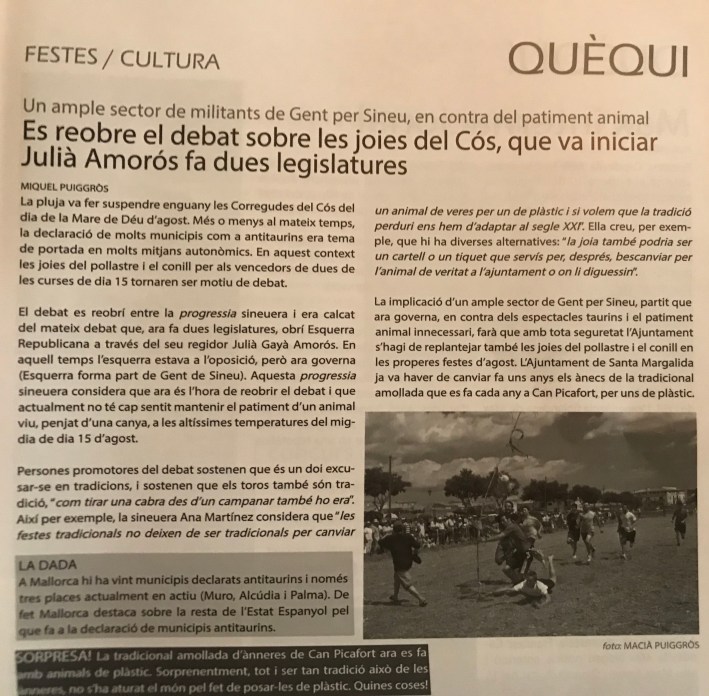 Aquesta és la imatge de les corregudes del Cós d’enguany. L’anterior equip de govern havia retirat els animals vius penjats de les joies, davant les queixes d’alguns veïnats i de les restriccions que estableix l’actual legislació en benestar animal. Aquests darrers anys, el pollastre i el conill eren dins gàbies, a l’ombra, i no fermats a una canya i al sol.