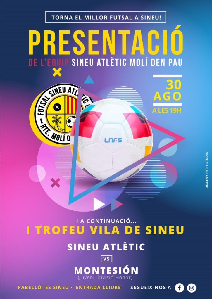 Divendres, a les 19,00 h i al pavelló de l’Institut, Sineu Atlètic Molí den Pau de futbol sala fa la presentació oficial de l’equip de la temporada 2019-2020. Un equip amb moltes cares noves per encarar la lliga de Tercera Divisió que s’inicia dia 28 de setembre. En aquesta primera jornada l’equip sineuer visitarà Entreculturas Montesión i el 5 d’octubre rebrà la visita del Gasifred d’Eivissa.