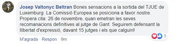 La Comissió Europea ha considerat que Espanya no podia reclamar l’extradició de Josep Valtònyc amb un codi penal posterior als fets pels quals va ser condemnat. En la vista oral del cas prejudicial al Tribunal de Justícia de la Unió Europea (TSJE) l’executiu europeu s’ha posicionat en línia amb els arguments de la defensa del cantant, defensant que l’estat no va fer correctament l’euroordre automàtica de Valtònyc. En canvi, Espanya i la fiscalia belga han sostingut durant la vista que el codi penal que cal tenir en compte és el vigent en el moment d’emetre l’euroordre.