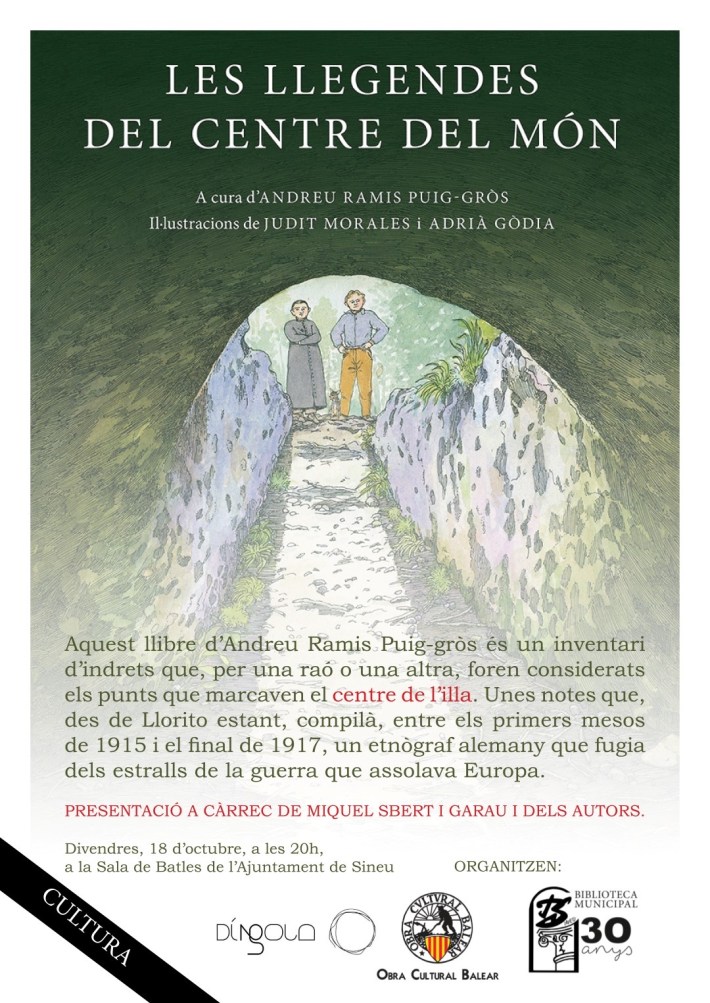 Les Llegendes del Centre del Món és el darrer llibre de l’etnòleg llorità Andreu Ramis Puig-gròs -prou conegut a Sineu i a la delegació local de l’OCB-, on parla sobre indrets que, fa un temps, foren considerats punts que marcaven el centre de l’illa. Entre aquests, el pou de Judí (Ruberts), la cova d’en Perico (Costitx), el campanar de l’església de Sineu, la torre de Son Gelabert d’Alt, el puig de Reig, entre molts altres. Un conjunt de fites carregades de significats que concentren les llegendes sobre la ubicació del punt central del món a Mallorca.