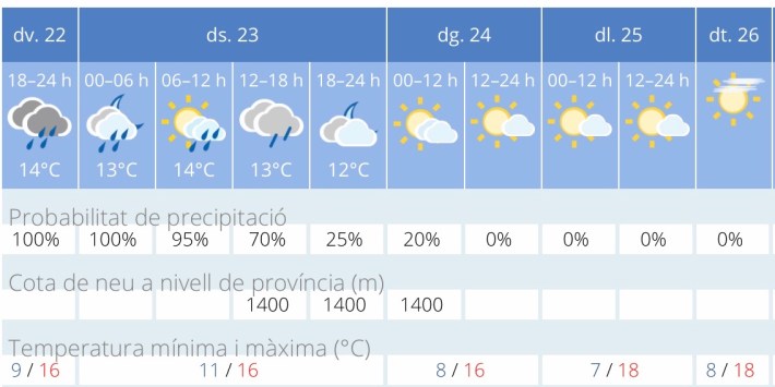 Plourà tota sa nit. Demà plourà gairebé tot el dia. Tot i això, el temps no millorarà durant el cap de setmana, i el mal temps pot durar fins ben entrada la setmana que ve. Consulta la previsió meteorològica de l’AEMET aquí (fes clic).