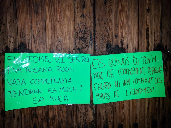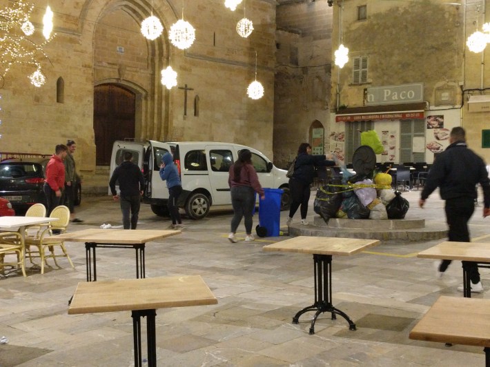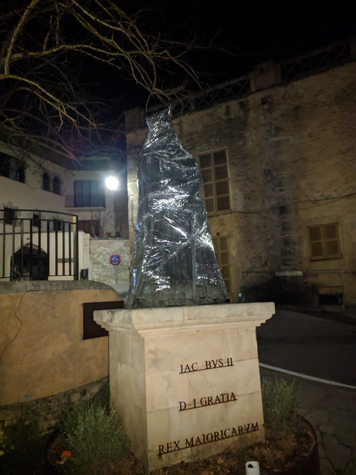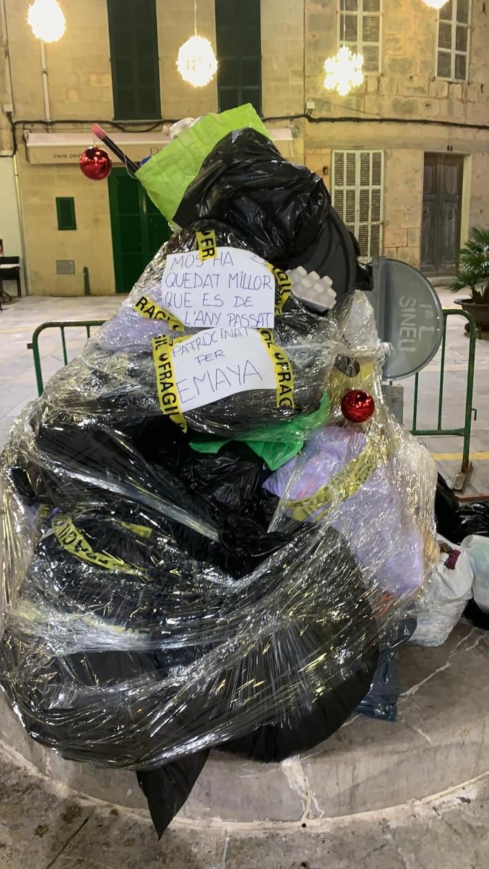 D’entre totes, per ventura podem destacar el “record” de l’arbre de Nadal de l’any passat fet de bosses de plàstic, que ells han escarnit amb bosses de fems arreplegades dels contenidors dels bars i poals d’orgànic dels veïnats de la Plaça, i també l’estàtua de Jacobus II tota embolicada de celofan.