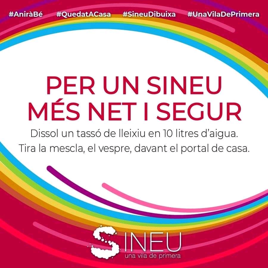 L’Ajuntament de Sineu demana, a través d’una campanya que ha començat a publicar a les xarxes socials, que cadascú ajudi a mantenir els carrers desinfectats, per si hi hagués restes portadores de COVID-19, coronavirus, amb una poalada d’aigua amb lleixivet. La fórmula que posen com a adequada són deu litres d’aigua (un poal gros) per un tassó de lleixivet. Aquesta solució desinfectant demanen que cadascú la tiri davant el portal de ca seva. Encara que sembla una solució molt casolana, és talment el que feim quan volem fregar a fons un trespol, és una fórmula ben efectiva contra l’agent víric COVID-19 i és el que empren els grups que aquests dies esquitxen els carrers de molts de pobles.