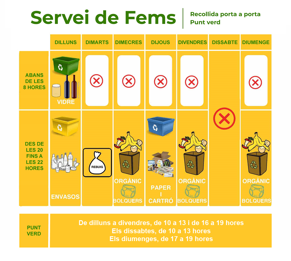 Dilluns, dia 4, el Punt Verd recuperarà l’horari ordinari d’abans de l’estat d’alarma. Es recorda que encara no s’hi poden dur residus voluminosos.