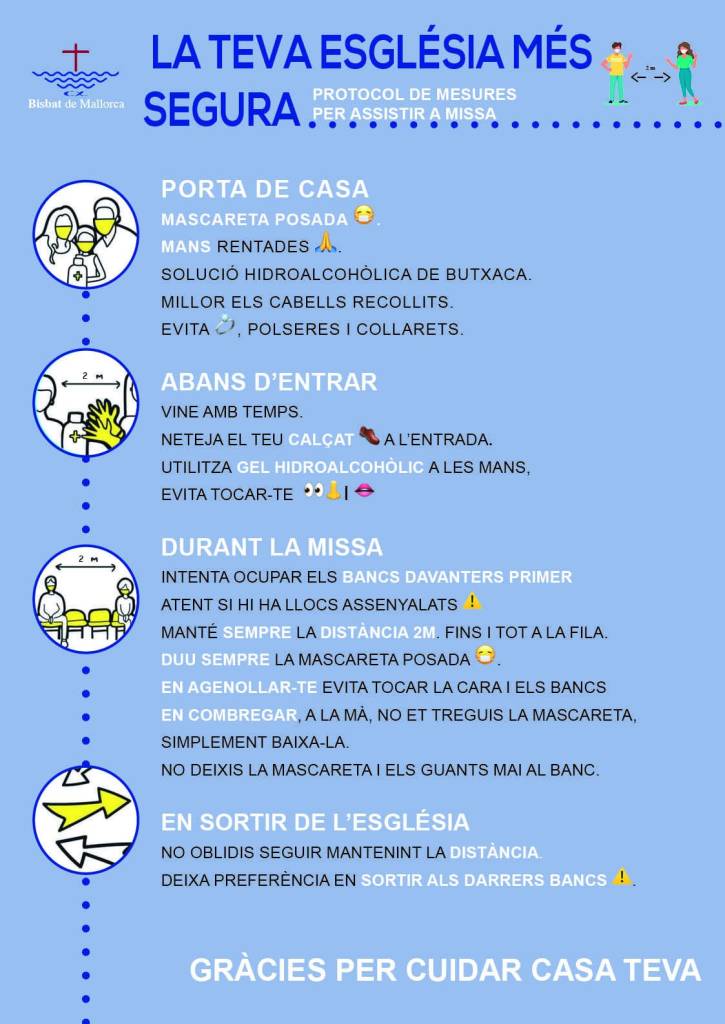 El rector Guillem Feliu ha anunciat que si bé l’església estarà oberta, ara per ara només es recuperaran les eucaristies dominicals (a Sineu els dissabtes a les 19 h i a Llubí els diumenges a les 11 h). Si hi hagués un difunt ja es podran fer funerals en l’horari acostumat, a les 19.30 h. S’introduiran variacions en les celebracions: se suprimeix el gest de la pau, s’organitzarà la comunió de manera que es respecti la distància de seguretat, se suprimeix la col·lecta abans de l’ofertori -es posarà la bacina al costat del batiport-, i el prevere celebrant s’haurà de desinfectar les mans abans de consagrar i donar la comunió.