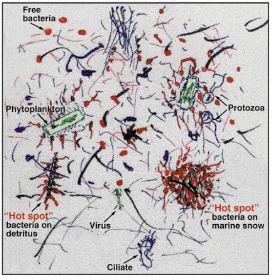 Al mar hi ha virus i la majoria no són patògens per a l’home, aniríem arreglats si ho fossin, però alguns poden produir infeccions i la destrucció d’organismes marins, en concret me referiré a aquells que ataquen les algues del fitoplàncton. Aquestes algues són les responsables de la producció primària, amb la qual s’inicia la xarxa tròfica que acaba en els peixos i en els gran mamífers marins. Baix determinades condicions és produeix la destrucció massiva d’algunes espècies del fitoplàncton per virus, la qual cosa provoca, a part de la mortaldat de les poblacions, l’alliberament de gran quantitat de matèria orgànica al mar que s’incorpora al cicle de la matèria i pot ser utilitzada pel altres organismes. Això que en principi és una pertorbació en la comunitat fitoplanctònica, pot tenir efectes beneficiosos, quan l’atac ocorre sobre proliferacions de fitoplàncton tòxic. A més a més hi ha evidències de que la destrucció de grans masses de fitoplàncton per virus i bacteris produeix l’alliberament a l’atmosfera d’un compost de sofre que actua de nucli condensador per formar núvols, que actuen atenuant l’escalfament del planeta.