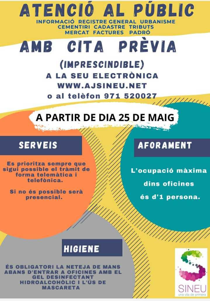 En particular a Sineu, l’Ajuntament tornarà a donar atenció presencial al públic amb cita prèvia que s’ha de demanar a la seu electrònica http://www.ajsineu.net o per telèfon al 971 520 027.