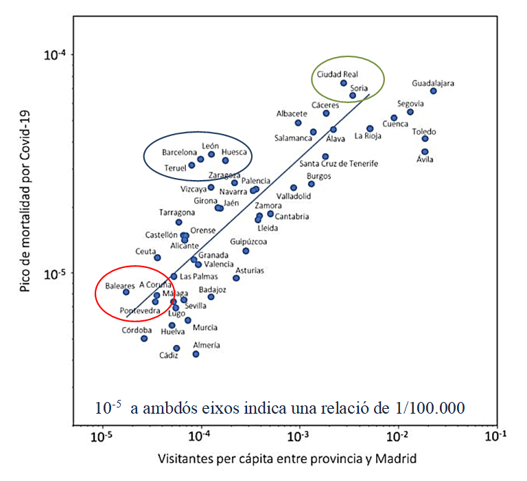 De seguida es veu que Barcelona, Lleó, Osca i Terol, tingueren una alta mortaldat que no s’explica per un elevat número de visites a Madrid. Mentre que les Balears s’adapten molt millor al model que es representa, amb un intercanvi de visitants baix amb Madrid, és dels llocs on el pic de mortaldat fou quasi bé dels més baixos de tot l’estat. A l’extrem superior del gràfic i trobem les províncies limítrofes amb Madrid, l’alta mobilitat s’explica pels trasllats per la feina, els retorns el caps de setmana, les estades a les segones residències, o per les visites accidentals per motius d’oci.