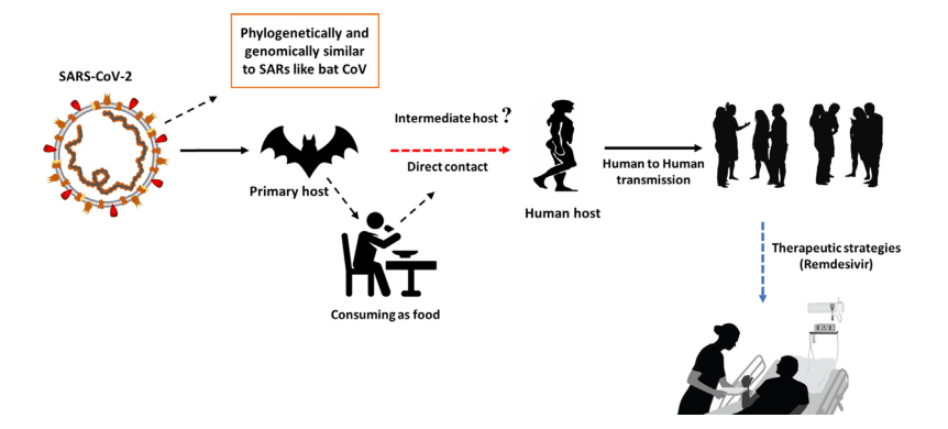 Aquesta figura és molt didàctica sobre les diferents fases de transmissió del virus causant de la infecció Covid-19, l’hoste primari és un ratpenat que per ingestió al transmet als humans i d’aquesta manera es va escampant a diferents individus de la població. L’article de qual l’he treta fou publicat el mes de març passat a la revista Journal of Advanced Research (M.A. Shereen et al., 24, 2020, 91-98). Aquí al manco hi ha un parell mallorquí de qüestions que criden l’atenció.