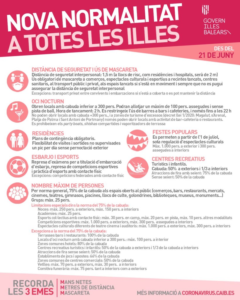 El Govern balear va publicar un BOIB, dissabte passat, en el qual s’aprova el Pla de Mesures Excepcionals de Prevenció, Contenció i Coordinació per fer front a la Crisi Sanitària Ocasionada per la COVID19, una vegada superada la fase 3 del Pla per a la Transició cap a una Nova Normalitat.