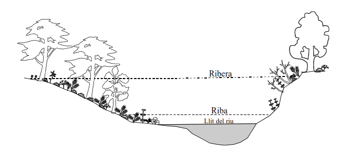 La figura adjunta és una visió idealitzada d’un riu temporal. Des del llit del riu, per on corre l’aigua, es van diferenciant una sèrie de comunitats vegetals. Prop i dintre de l’aigua hi podem trobar: algues, plantes aquàtiques submergides, a més de la bova (Typha latifolia), la canya (Arundo donax) i/o el canyet (Phragmites australis); a la riba i a la ribera pot haver-hi: pollancres, oms, freixes, cirerers de pastor, arranyoners, entre d’altres, i plantes herbàcia pròpies de sóls rics en nitrogen. A molts de torrents del Pla la vegetació està simplificada fins a l’extrem de no haver-hi més que canya o canyet, que ha colonitzat i ocupat fins i tot el llit del torrent. Això suposa un greu problema a l’hora de netejar-lo per no obstruir la circulació de l’aigua i evitar les inundacions.