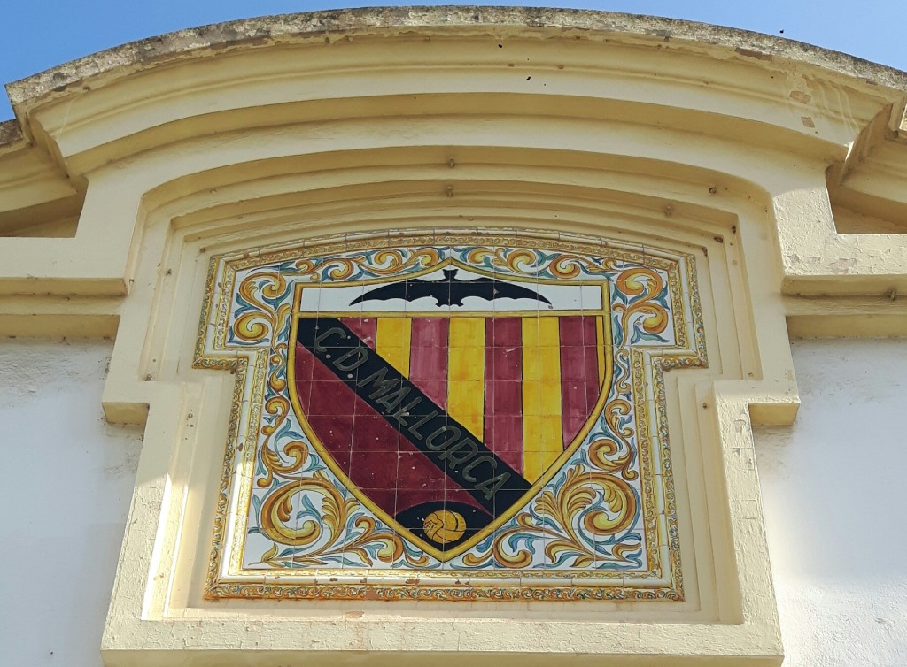 >>A la porta del que resta de l’estadi del Fortí, més conegut com Lluís Sitjar, hi ha aquesta marquesina amb un dels escuts que ha tingut el Mallorca al llarg de la seva historia. A banda del seu interès com emblema del club, quan el miro penso en que potser qualsevol dia hi passarà una màquina o tal volta una guarda de desaprensius i l’enviaran en orris. És una llàstima no haver conservat aquest escut, on hi trobem elements que representen els colors del Mallorca, i de la història de Mallorca, entre els quals el ratpenat, un animal constant a l’heràldica de molts dels antics territoris de la Corona d’Aragó.