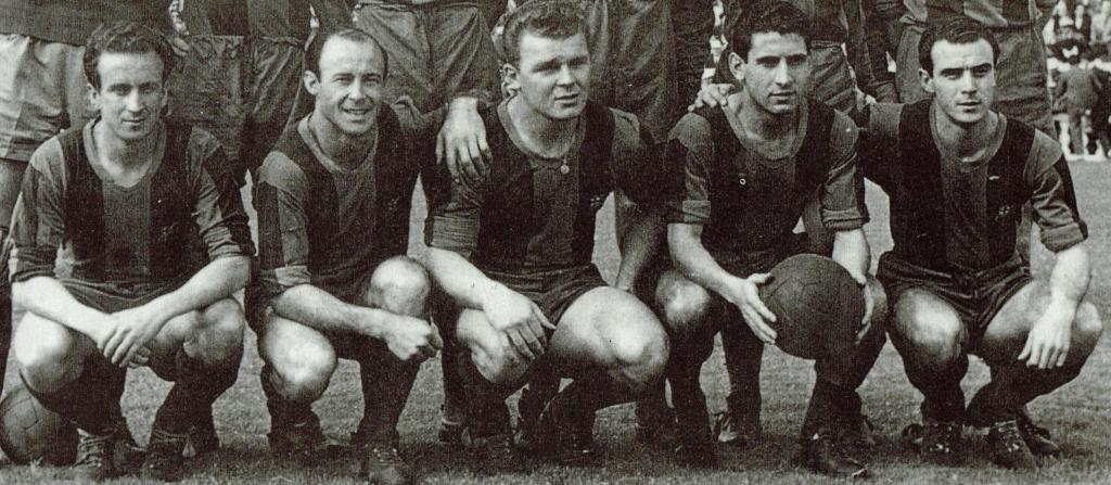 >>Per als nostàlgics, entre els quals m’hi trob, aquesta és la davantera del Barça del anys 50, a la que fa esment la cançó d’en Joan Manuel Serrat. (Imatge treta del Gran Àlbum del Barça, cent anys en blau i grana, publicat per La Vanguardia).