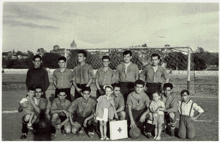 >>Formació del Sineu a un partit a casa l’any 1954, el campanar delata d’on està tirada la fotografia. Era un equip jove, aquest dia no jugaven dos dels puntals de l’equip, en Floquet i en Boiret. En Joan Bietriu surt a totes les imatges d’aquella època perquè durant molts d’anys fou els responsable de la farmaciola, altra temps dit botiquín de l’equip. La camisa era de color vermell i els pantalons negres. No dic l’alineació perquè potser en fallaria algun, ho deixo per les lectores i els lectors menys joves.
