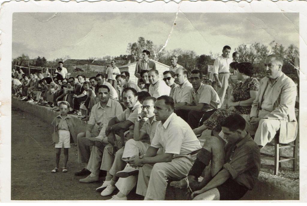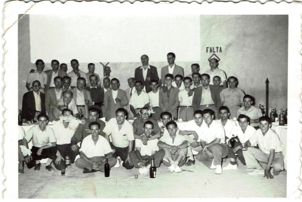 >>Imatge d’un sopar al Frontón dels jugadors del Sineu i alguns aspirants a ciclistes, amb els directius, i les autoritats, fet que evidencia la capacitat de convocatòria que l’any 1955 tenia l’esport pel jovent del poble. Serveixi també la fotografia per recordar la importància del Frontón pels qui ens agradava jugar a futbol, cada tarda de l’estiu hi havia un partit, en què ens hi podíem replegar més de vint persones. I també pel cinema a l’aire lliure, un autèntic luxe per als sineuers. Quina llàstima no haver conservat aquest espai!