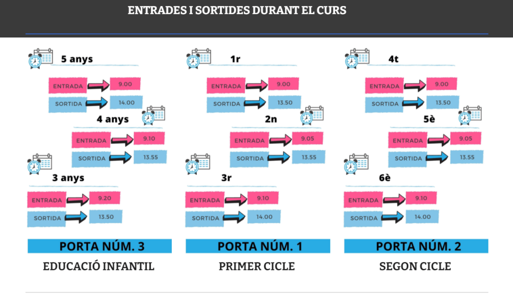 A partir de dilluns 14, a excepció de l’alumnat de 3 anys que farà 3 dies més d’adaptació, la resta de nivells i grups ja anirà a classe amb horari complet, si bé al llarg de tot l’any hi haurà uns horaris específics d’entrada i sortida per nivells, amb intervals de 5 o 10 minuts, per tal d’evitar aglomeracions. Així, l’entrada serà entre les 9,00h i les 9,20h, mentre que la sortida serà de les 13,50h a les 14.00h. i sempre per accessos diferents.