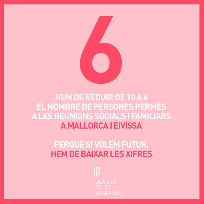 La presidenta Armengol ha anunciat avui que dissabte entrarà en vigor una mesura que limitarà a sis persones les reunions familiars o socials a Mallorca i a Eivissa. La mesura anticovid s’aplica a fi de mirar d’aplanar la corba d’incidència a les dues illes.