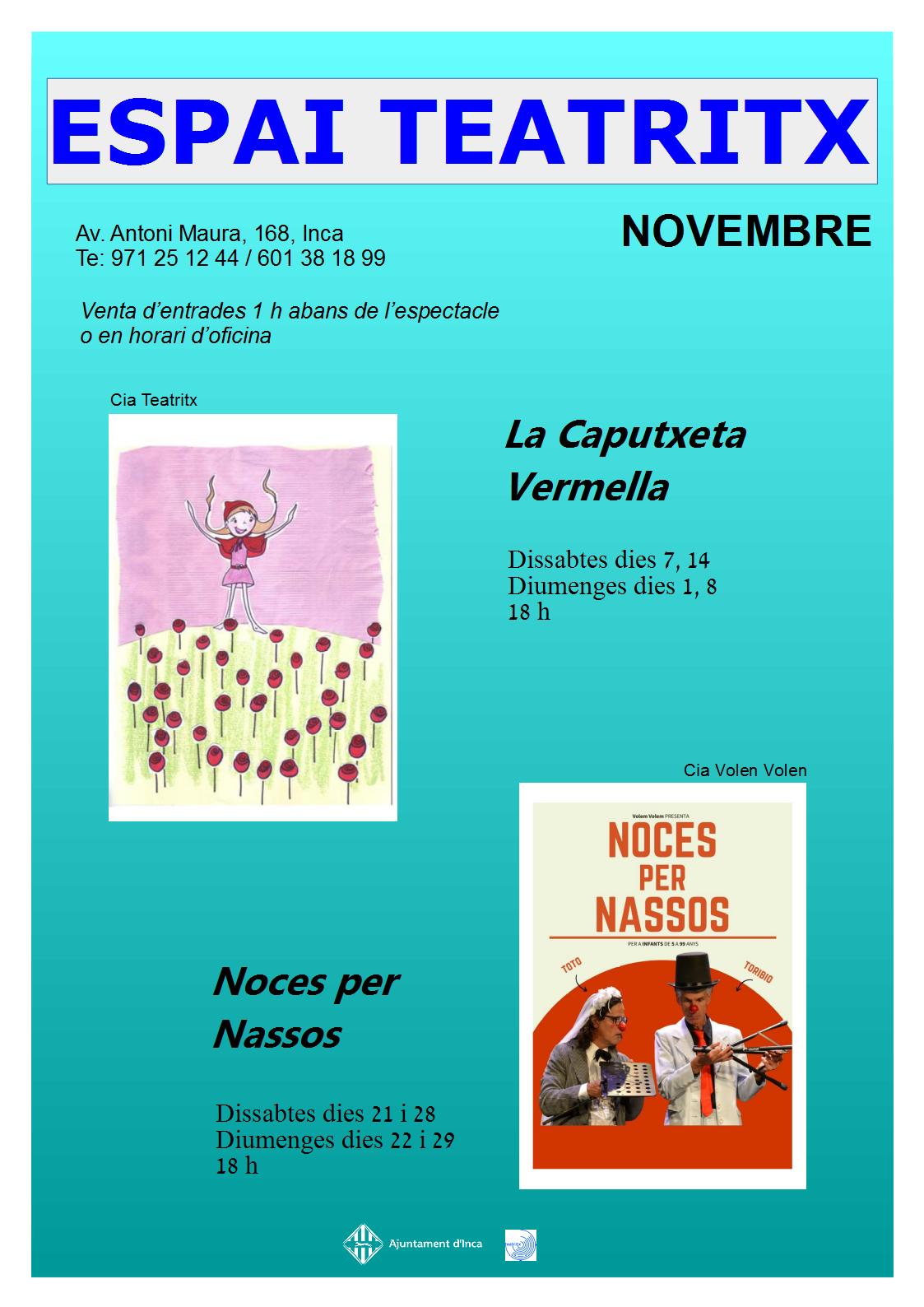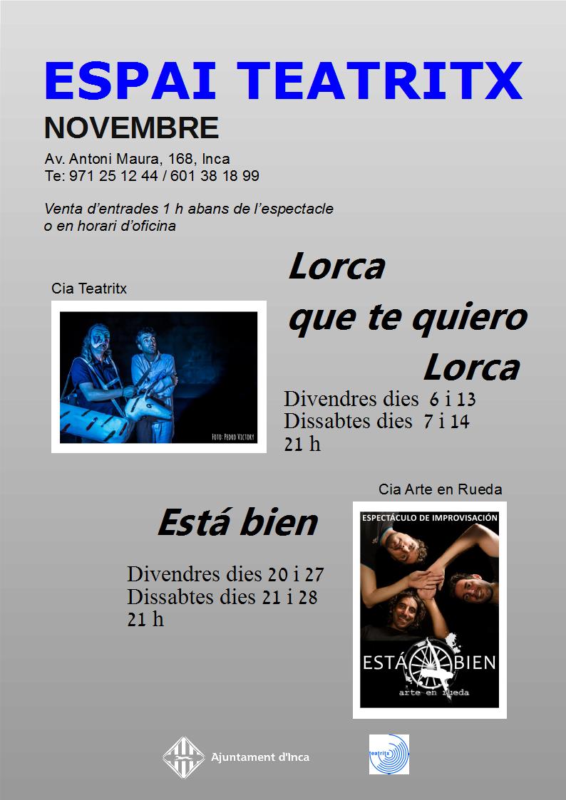 Teatritx inaugura aquest divendres 23 una sala d’arts escèniques a Inca, l’Espai Teatritx, un lloc que vol oferir tot tipus d’espectacles, però també vol servir per resoldre qualsevol necessitat artística (per exemple la confecció de guions a mida, tallers, escola de teatre, etc…).